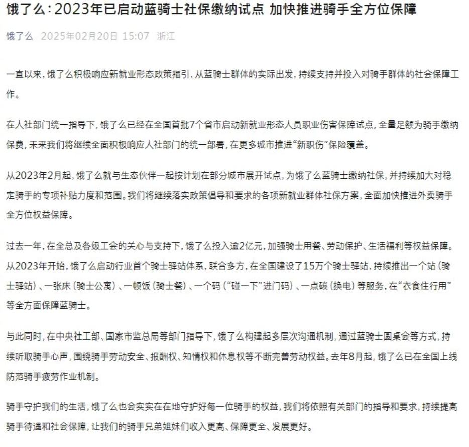 2月20日,饿了么官方公众号发文称,一直以来,饿了么积极响应新就业形态政策指引,从蓝骑士群体的实际出发,持续支持并投入对骑手群体的社会保障工作。在人社部门统一指导下,饿了么已经在全国首批7个省市启动新就业形态人员职业伤害保障试点,全量足额为骑手缴纳保费。