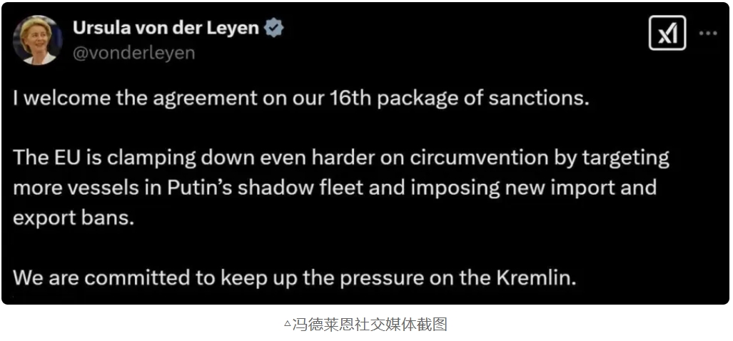 在对俄第 16 轮制裁协议达成的当天,欧盟委员会主席冯德莱恩表示,欧盟致力于继续对俄罗斯施加压力。