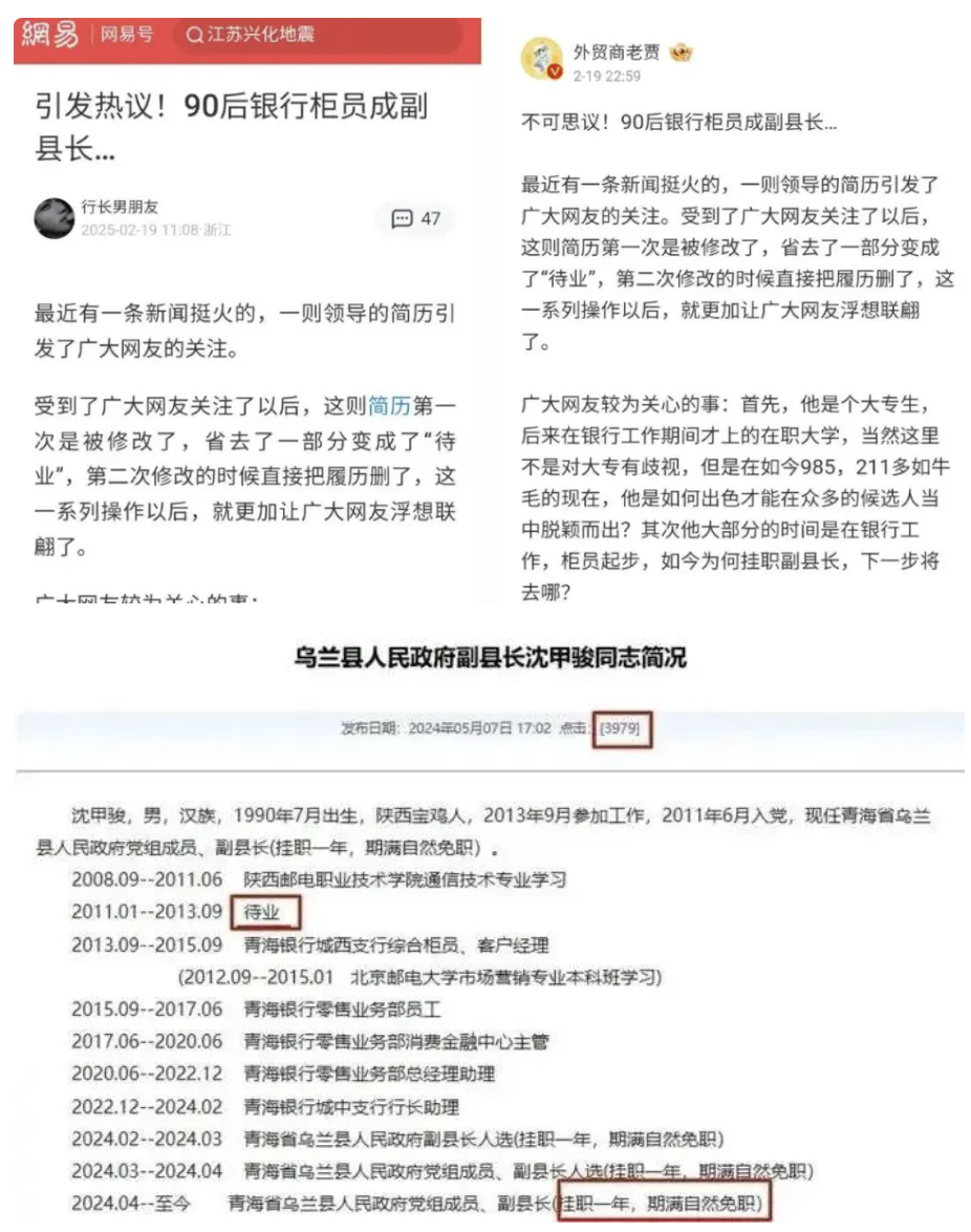 据顶端新闻,近日,一则“90后银行柜员成副县长”的消息引发网友热议。网传简历显示,青海省乌兰县挂职副县长沈甲骏,曾在青海银行城西支行综合柜员岗工作,2022年升任青海银行城中支行行长助理,2024年2月份进入乌兰县人民政府。