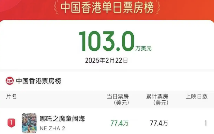 2月23日,据猫眼专业版全球票房数据显示,电影《哪吒之魔童闹海》中国香港上映首日(22日)票房报收77.4万美元(超600万港元),登顶中国香港单日票房榜。上映首日,《哪吒之魔童闹海》成为中国香港及澳门动画电影开画票房冠军,内地电影开画票房冠军。