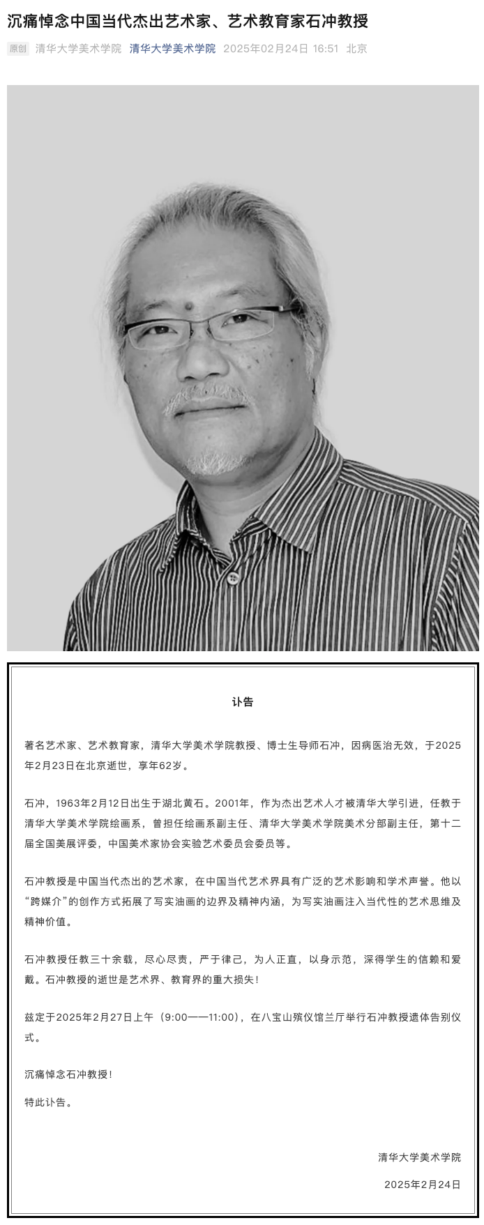 据界面,2月24日,清华大学美术学院发讣告,著名艺术家、艺术教育家,清华大学美术学院教授、博士生导师石冲,因病医治无效,于2025年2月23日在北京逝世,享年62岁。
