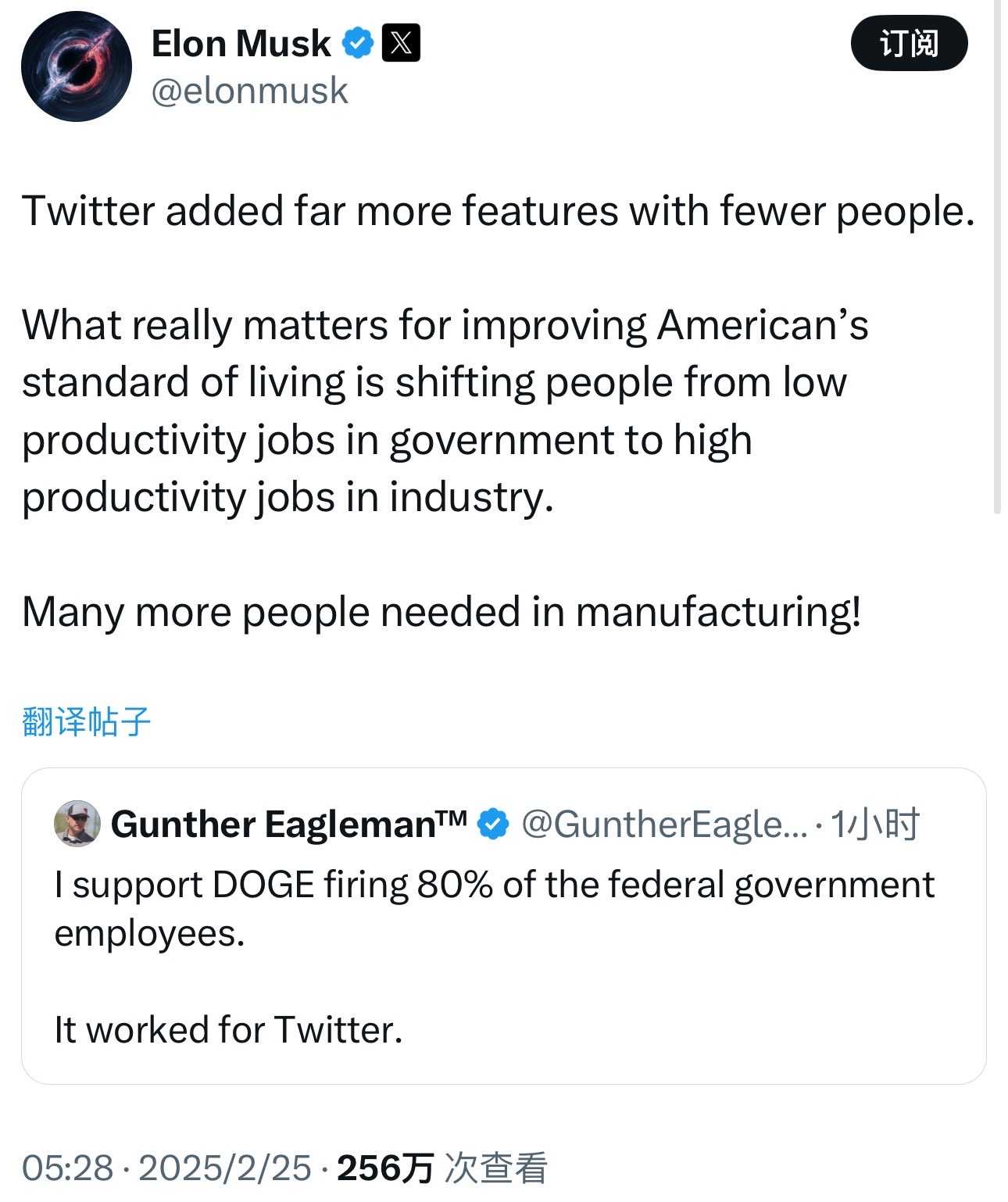马斯克:政府低效率工作人员应该从事制造业。马斯克在其社交平台发文回复“解雇80% 的联邦政府雇员”时称,对于提高美国人的生活水平而言,真正重要的是将人们从政府的低生产率工作转移到工业领域的高生产率工作上。制造业需要更多的人手!