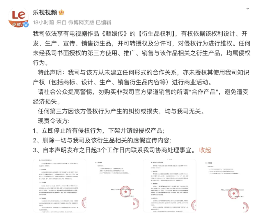 乐视视频责令该方:“立即停止所有侵权行为,下架并销毁侵权产品;删除一切与我司及该衍生品相关的虚假宣传内容;自本声明发布之日起3个工作日内联系我司协商处理事宜。”