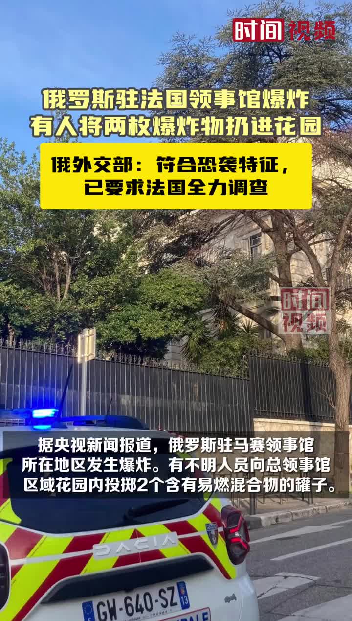 当地时间2月24日,法国马赛。据央视新闻报道,俄罗斯驻马赛领事馆所在地区发生爆炸。有不明人员向总领事馆区域花园内投掷2个含有易燃混合物的罐子。俄罗斯外交部发言人扎哈罗娃表示,爆炸事件拥有恐怖袭击的所有特征,已要求法国采用一切措施来调查。 (via 时间视频)