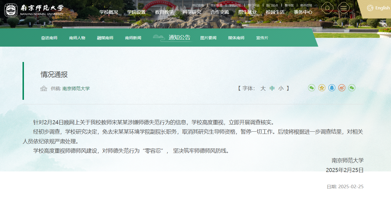 南师大通报宋某某涉嫌师德失范:免职,暂停一切工作。