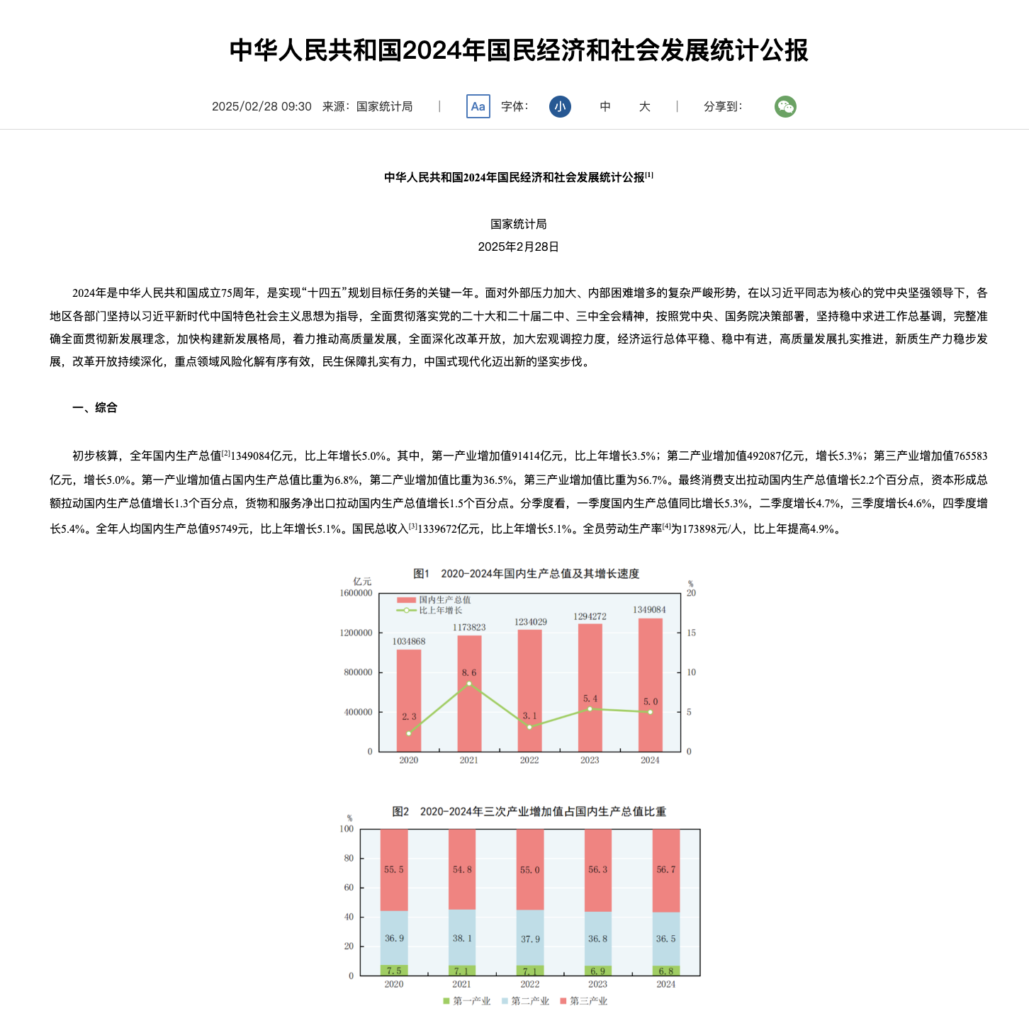 国家统计局:2024年国内生产总值比上年增长5.0%。