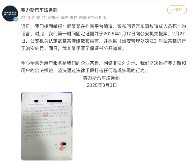 据界面,3月3日,赛力斯汽车法务部发文:近日,我们接到举报,武某某在抖音平台编造、散布问界汽车事故造成人员死亡的谣言。对此,我们第一时间固定证据并于2025年2月17日向公安机关报案。2月27日,公安机关认定武某某涉嫌散布谣言,并根据《治安管理处罚法》对武某某进行了治安处罚。同日,武某某手写了保证书公开道歉。