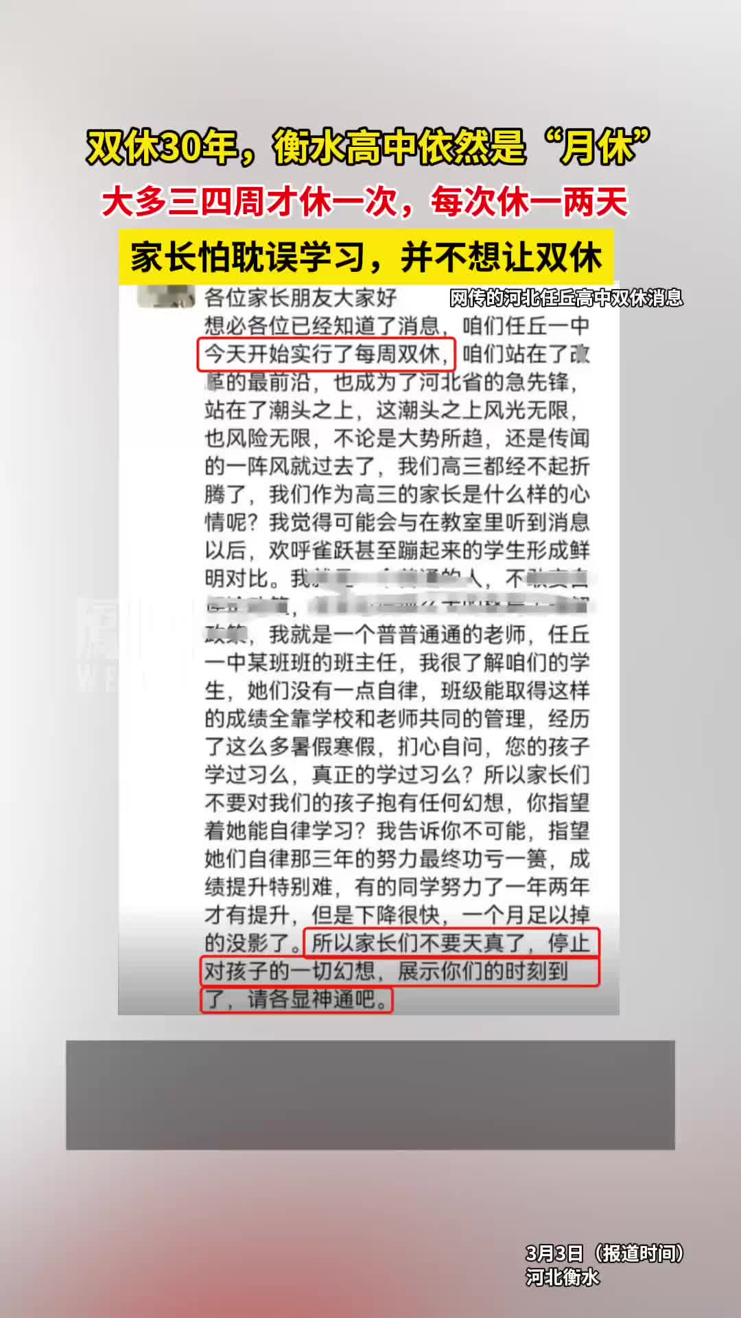 衡水学生家长认为双休是胡搞。