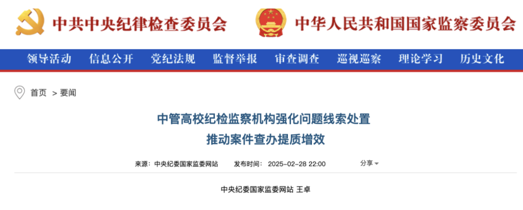 据每经,中央纪委国家监委网站2月28日刊发文章《中管高校纪检监察机构强化问题线索处置推动案件查办提质增效》。