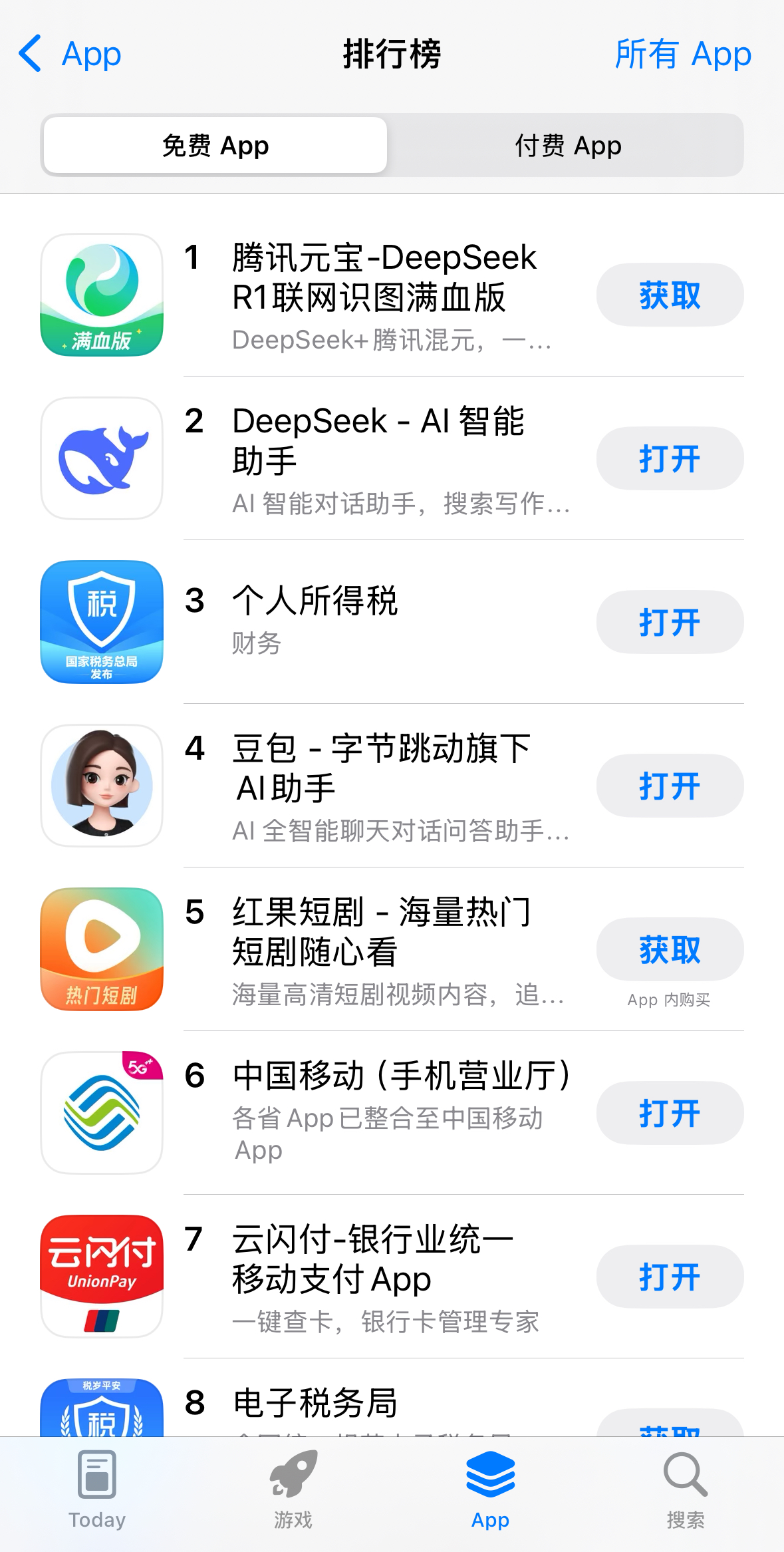 超越DeepSeek,腾讯元宝登顶苹果中国区免费APP下载排行榜。