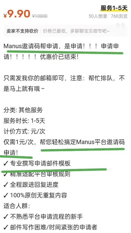 Manus邀请码被曝炒到10万元,代写申请邮件也成有偿业务。