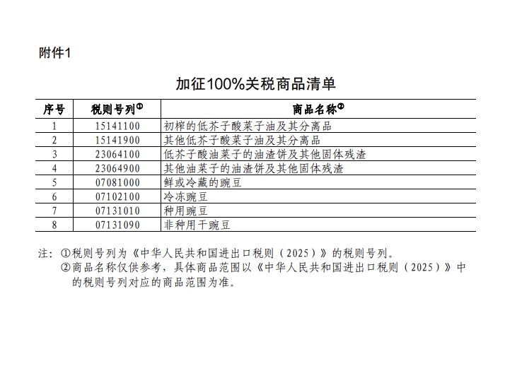 根据《中华人民共和国关税法》、《中华人民共和国海关法》、《中华人民共和国对外贸易法》等法律法规和国际法基本原则,经国务院批准,国务院关税税则委员会发布公告,自2025年3月20日起,对原产于加拿大的菜子油、油渣饼、豌豆加征100%关税;对原产于加拿大的水产品、猪肉加征25%关税。中方敦促加方理性看待双边经贸合作,尊重客观事实,遵守世界贸易组织规则,立即纠正错误做法。