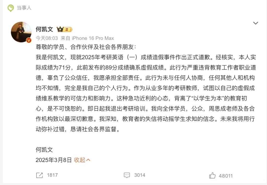 “考研名师”何凯文就成绩造假致歉:真实成绩71分,即日起退出考研培训行业。