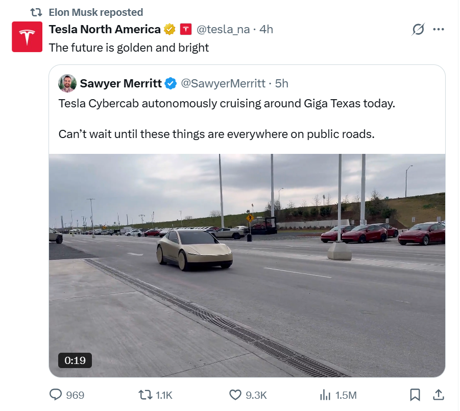 据界面,特斯拉CEO埃隆·马斯克3月9日在社交平台X上转发了一条关于特斯拉无人驾驶出租车(Cybercab)的贴文,贴文称:“特斯拉Cybercab今天在得克萨斯超级工厂附近自动驾驶巡游。真等不及这些车遍布公共道路的那一天了。”视频中是一辆金色的特斯拉Cybercab,据博主介绍,这是一辆双座车。