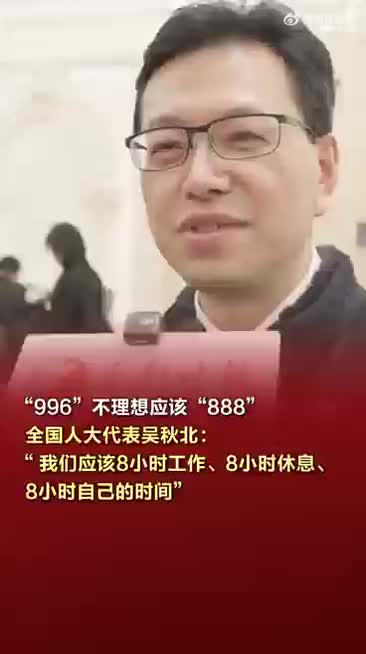 全国人大代表、香港工联会会长吴秋北:“996”长时间工作是非常不理想的!我们应该“8小时工作 8小时休息 8小时个人时间”(via 金融时报)
