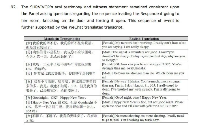 国际乒联的调查基于受害者的陈述以及双方的聊天记录。聊天记录显示,徐克主动询问受害者的房间号,并在对方表示要睡觉的情况下,仍然坚持进入房间“再聊一会儿”。此外,裁决提到,徐克的行为严重违反了国际乒联的反骚扰政策,且调查过程中未发现徐克提供的有效证据来反驳指控。