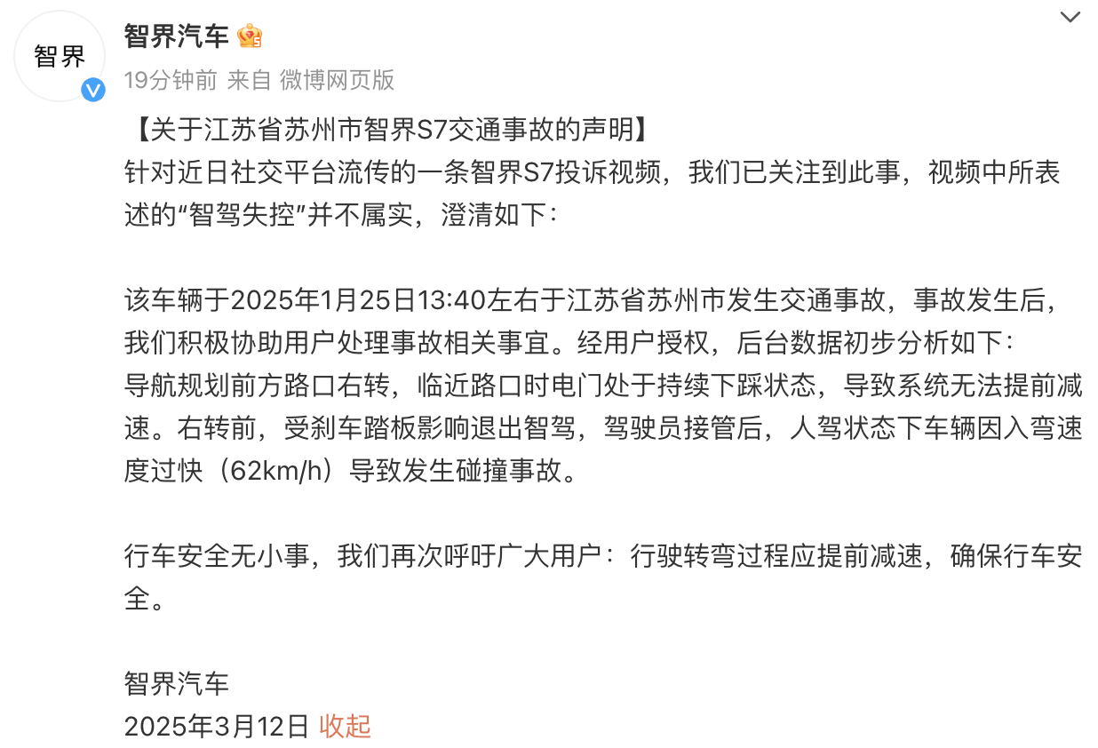 据九派新闻,3月12日,@智界汽车 发布“关于江苏省苏州市智界S7交通事故的声明”: