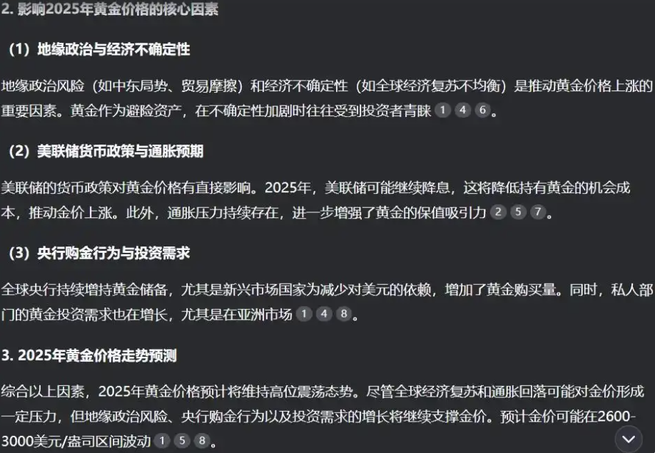 DeepSeek预测,由于地缘政治与经济不确定性、美联储货币政策与通胀预期,以及央行购金行为与投资需求,2025年黄金价格将维持高位震荡态势。