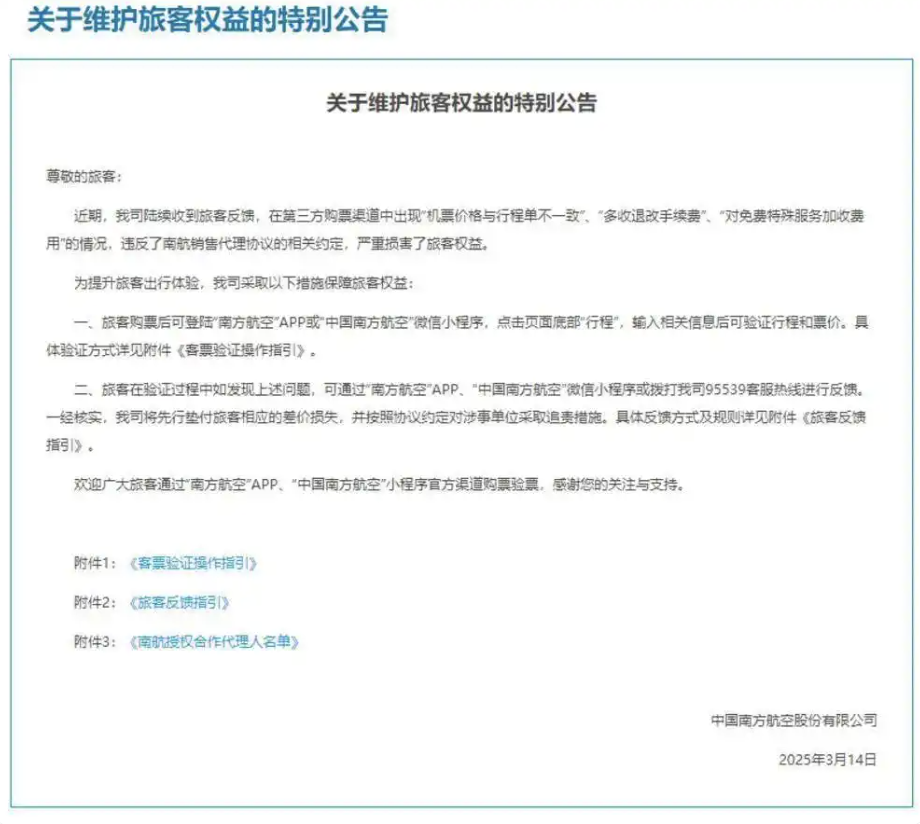 3月14日,中国南方航空(以下简称“南航”)发布《关于维护旅客权益的特别公告》。即日起,针对旅客在第三方购票渠道中出现的“机票价格与行程单不一致”“多收退改手续费”“对免费特殊服务加收费用”三类情况,南航在“南方航空”APP、“中国南方航空”微信小程序和95539客服热线开设购票问题反馈通道,经旅客本人反馈并成功核实后,南航将先行垫付旅客相应的差价损失,并按照协议约定对涉事单位采取追责措施。