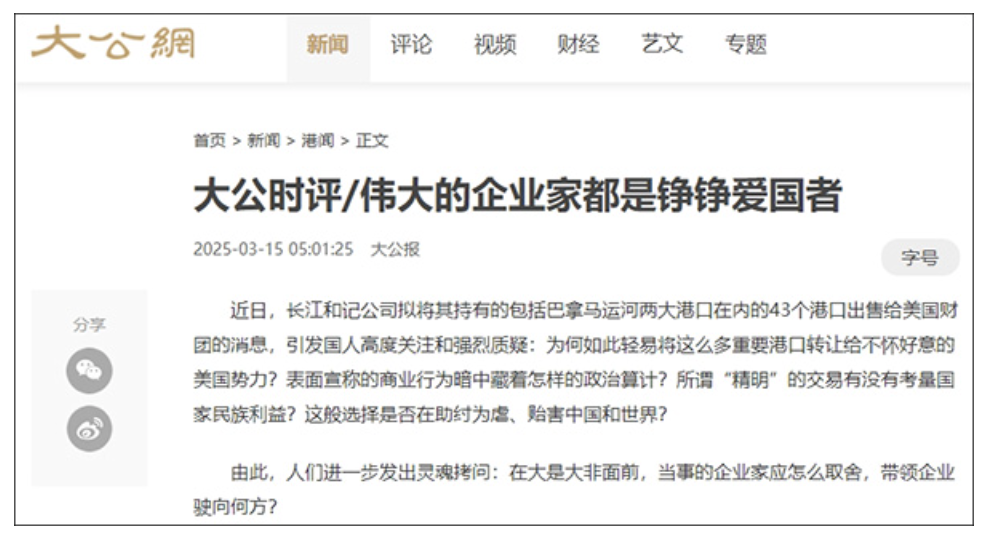 据观察者网,3月15日,香港《大公报》发布题为“伟大的企业家都是铮铮爱国者”的时评,就李嘉诚旗下香港长江和记实业有限公司拟将包括巴拿马运河两大港口在内的43个港口出售给美国财团的消息提出5个问题。