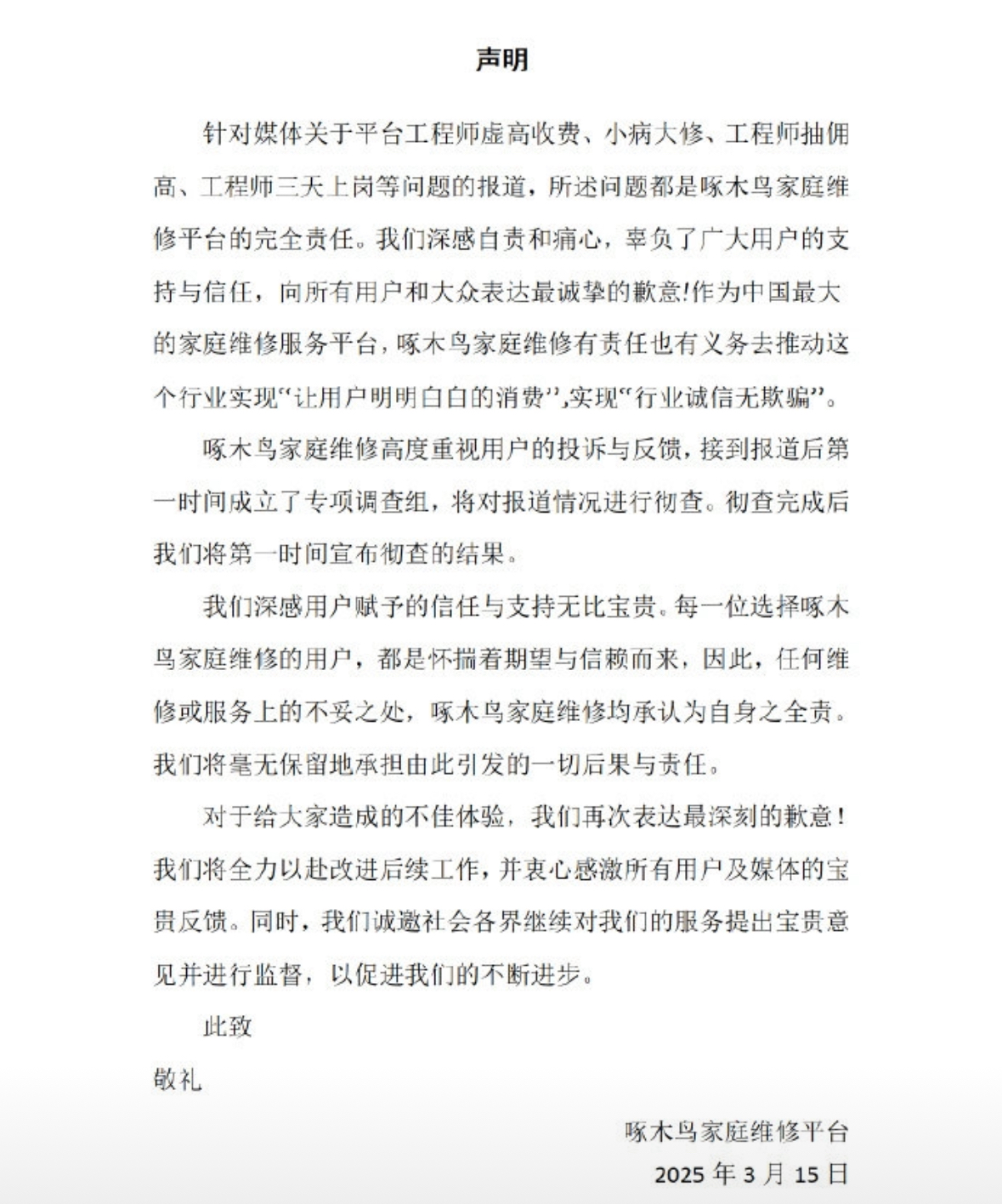 随后,啄木鸟家庭维修发布声明:针对媒体关于平台工程师虚高收费、小病大修、工程师抽佣高、工程师三天上岗等问题的报道,所述问题都是啄木鸟家庭维修平台的完全责任。我们深感自责和痛心,辜负了广大用户的支持与信任,向所有用户和大众表达最诚挚的歉意!作为中国最大的家庭维修服务平台,啄木鸟家庭维修有责任也有义务去推动这个行业实现“让用户明明白白的消费”实现“行业诚信无欺骗”。啄木鸟家庭维修高度重视用户的投诉与反馈,接到报道后第一时间成立了专项调查组,将对报道情况进行彻查。彻查完成后我们将第一时间宣布彻查的结果。