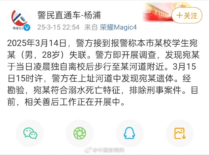 据中国新闻网,“警民直通车-杨浦”15日晚通报:3月14日,警方接到报警称本市某校学生宛某(男,28岁)失联。警方即开展调查,发现宛某于当日凌晨独自离校后步行至某河道附近。3月15日15时许,警方在上址河道中发现宛某遗体。经勘验,宛某符合溺水死亡特征,排除刑事案件。目前,相关善后工作正在开展中。