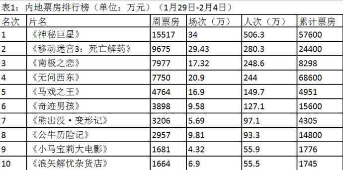 #内地一周票房#《神秘巨星》上映第三周再收1.55亿,坐稳周冠;《移动迷宫3:死亡解药》表现不俗上升至第二位,票房为9675万;《南极之恋》在周五逆袭拿下单日冠军后,首周累计7977万,居第三;《无问西东》可怜的被挤到了第四,票房7750万。(消息源来自@新浪电影)