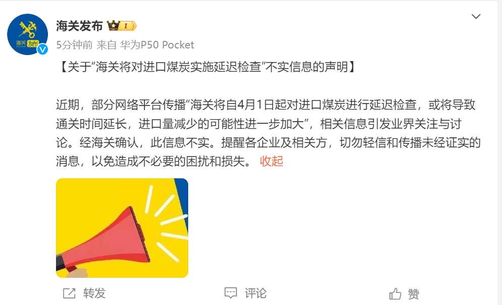 海关发布:“海关将对进口煤炭实施延迟检查”为不实信息。