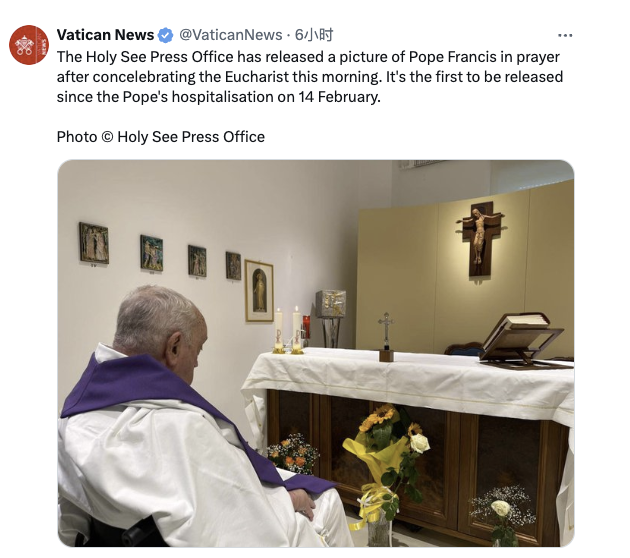 梵蒂冈公布教皇方济各住院后的首张照片。