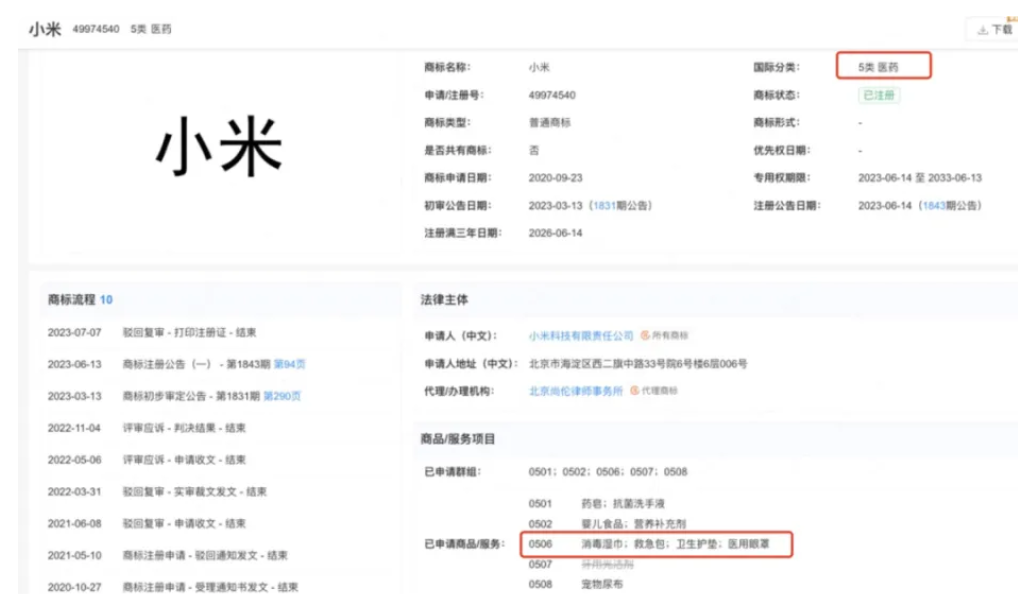 据读秒财经报道,企查查App显示,小米科技有限责任公司此前已取得的“小米”商标中,包含消毒湿巾、救急包、卫生护垫、医用眼罩等商品服务。