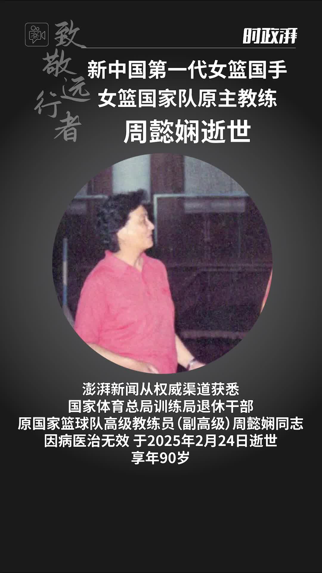 据澎湃新闻记者从权威渠道获悉,国家体育总局训练局退休干部、原国家篮球队高级教练员(副高级)周懿娴同志,因病医治无效,于2025年2月24日逝世,享年90岁。