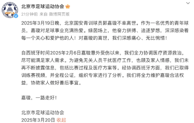 3月20日,北京足协发文:3月19日晚,北京国安青训球员郭嘉璇不幸离世。文中称,自嘉璇意外受伤以来,足协全力协调医疗资源救治。已取得训练赛视频并全程公证组织专家进行分析。