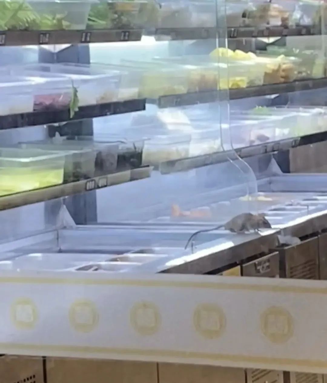 2月19日,广西东兴,杨国福麻辣烫北仑大道店打包麻辣烫,消费者发现一只老鼠在餐品展示台上。