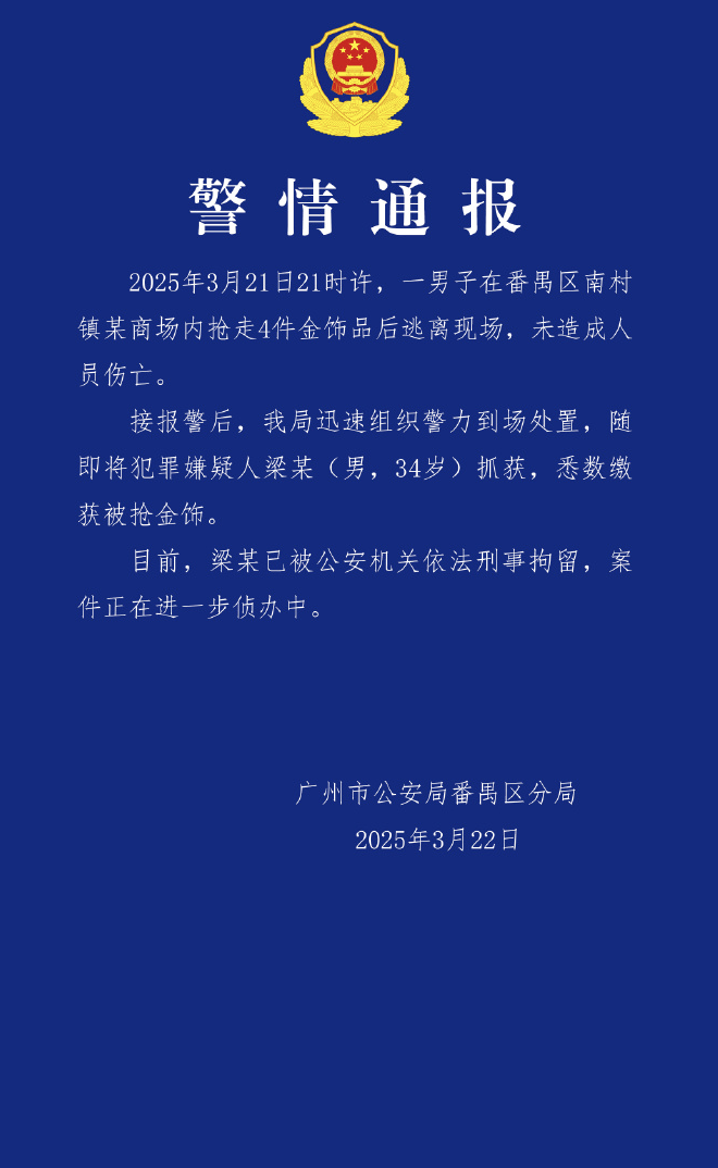 3月22日,广州市公安局番禺分局发布警情通报:2025年3月21日21时许,一男子在番禺区南村镇某商场内抢走4件金饰品后逃离现场,未造成人员伤亡。接报警后,我局迅速组织警力到场处置,随即将犯罪嫌疑人梁某(男,34岁)抓获,悉数缴获被抢金饰。目前,梁某已被公安机关依法刑事拘留,案件正在进一步侦办中。
