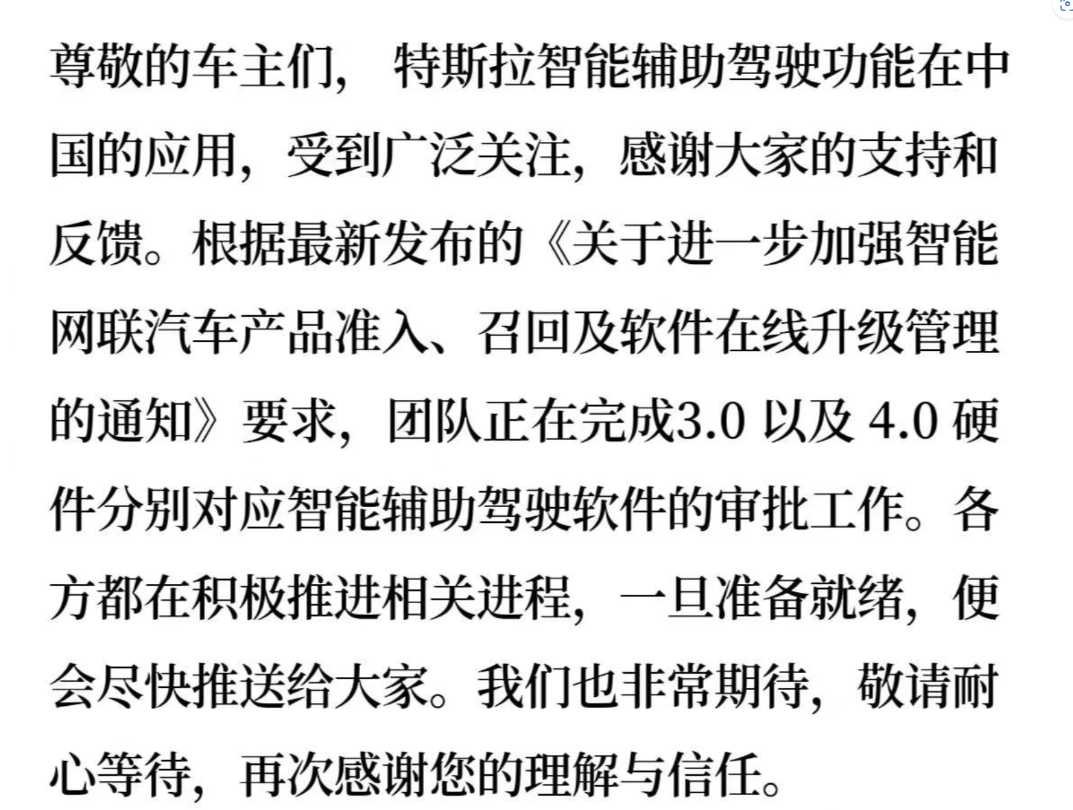 特斯拉客户支持官微在特斯拉公司副总裁陶琳的微博评论区回应了“暂停 FSD 推送”的消息。尊敬的车主们,特斯拉智能辅助驾驶功能在中国的应用,受到广泛关注,感谢大家的支持和反馈。根据最新发布的《关于进一步加强智能网联汽车产品准入、召回及软件在线升级管理的通知》要求,团队正在完成3.0以及4.0硬件分别对应智能辅助驾驶软件的审批工作。各方都在积极推进相关进程,一旦准备就绪,便会尽快推送给大家。