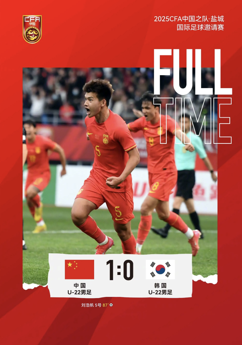 据中新网,北京时间3月23日,2025年中国之队国际足球邀请赛循环赛第二轮在盐城奥体中心体育场结束了一场较量,中国U22男足1:0击败韩国U22男足,取得本次四国赛首胜。第87分钟,21岁的中后卫刘浩帆门前爆射打入全场唯一进球。
