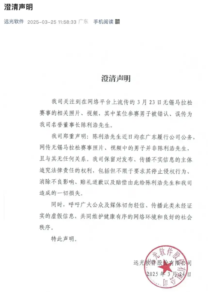 据潇湘晨报,3月23日,无锡马拉松开跑,在比赛期间,一对举止亲密的男女被拍到并引发广泛传播和热议,远光软件在24日晚发布澄清声明,视频中的男子并非远光软件的名誉董事长陈利浩。