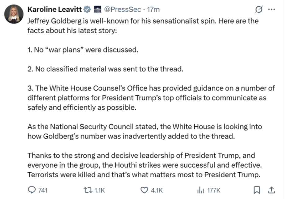 白宫新闻秘书:“泄密”群聊没谈作战计划,有人被“无意”拉进群。