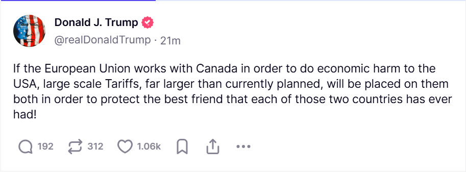 当地时间3月26日,美国总统特朗普在社交平台上发文称,“如果欧盟与加拿大合作一道损害美国经济,那么为了保护美国(欧盟和加拿大各自所拥有过的最好的朋友),我们将对他们征收远超当前计划的大规模关税!”