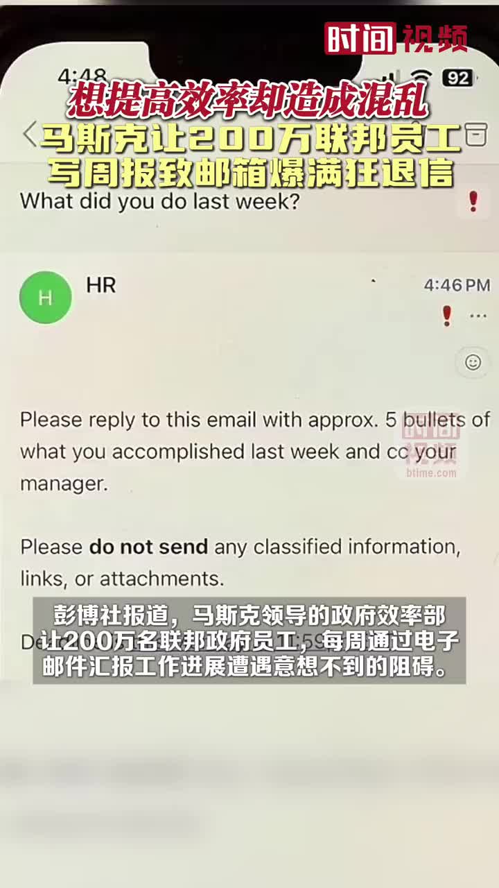 当地时间3月26日,彭博社报道,马斯克领导的政府效率部让200万名联邦政府员工,每周通过电子邮件汇报工作进展遭遇意想不到的阻碍。联邦政府员工按照指示发送大量邮件,导致收件箱不堪重负,邮件服务器开始退回新邮件,并提示“邮箱已满”。马斯克此举意在提高政府效率并亲自监督联邦机构的工作。然而这一前所未有的要求迅速引发了混乱。 (via 时间视频)