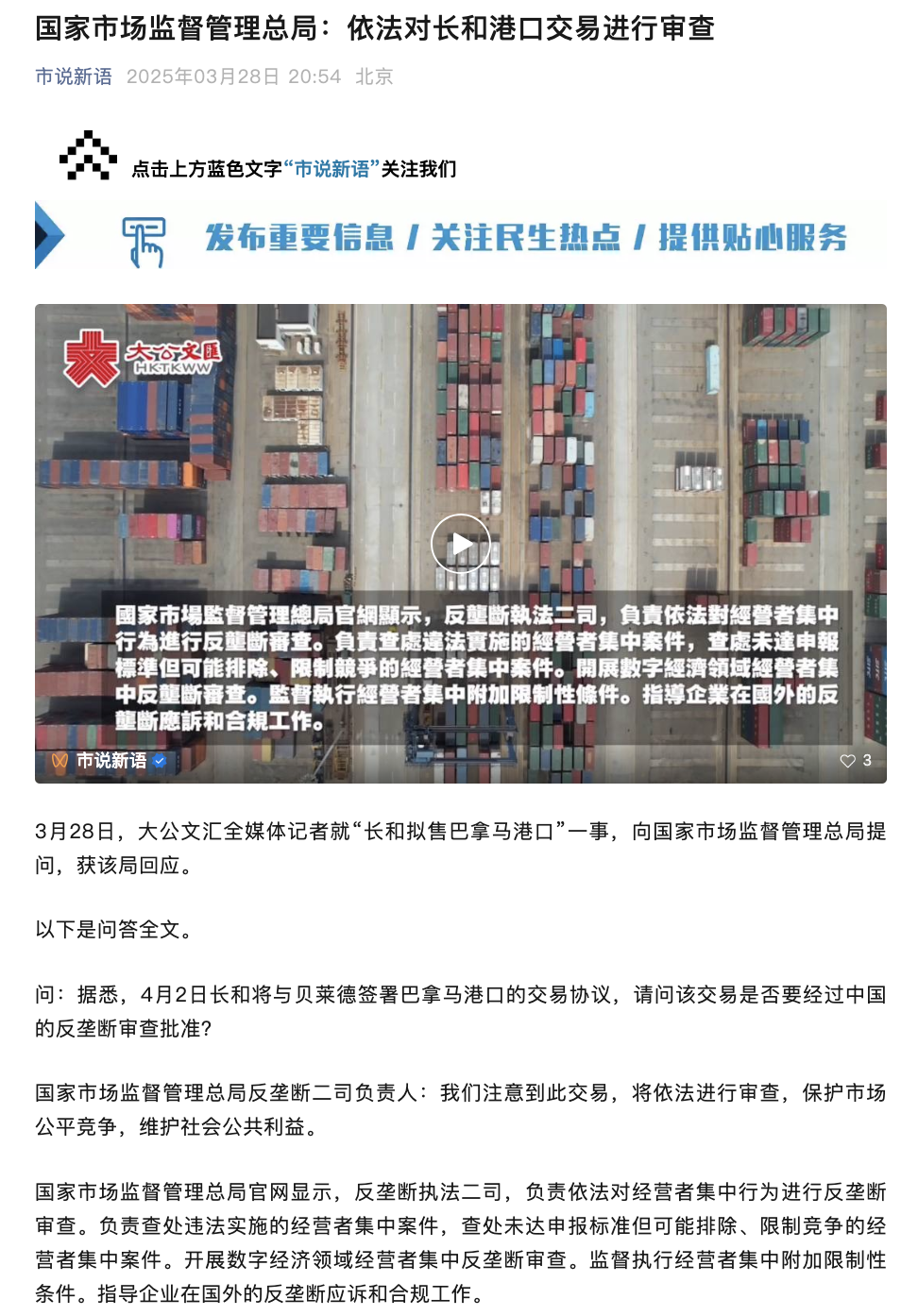 据市说新语微信公号,3月28日,大公文汇全媒体记者就“长和拟售巴拿马港口”一事,向国家市场监督管理总局提问,获该局回应。