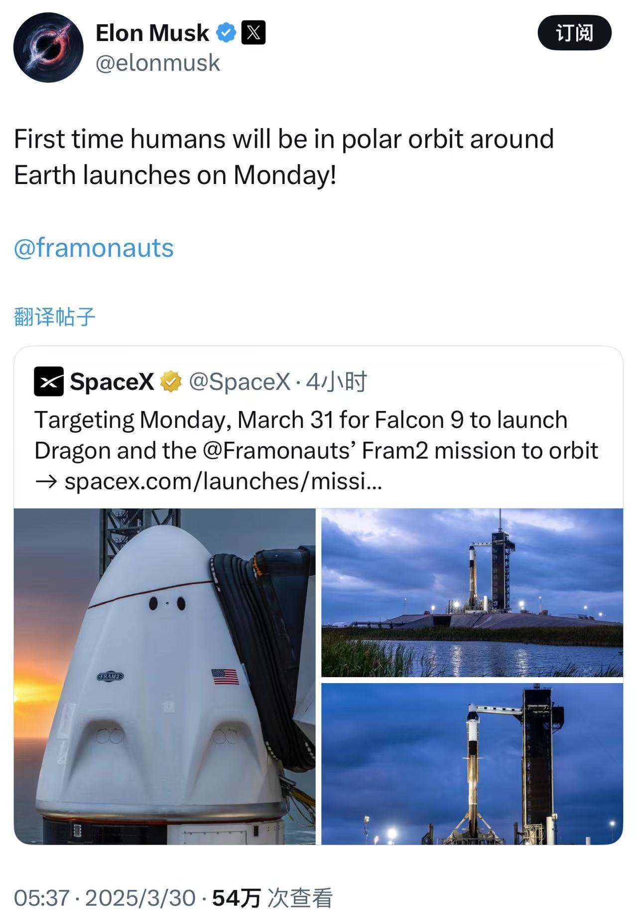 马斯克:人类首次绕地球极地轨道飞行将于周一发射。