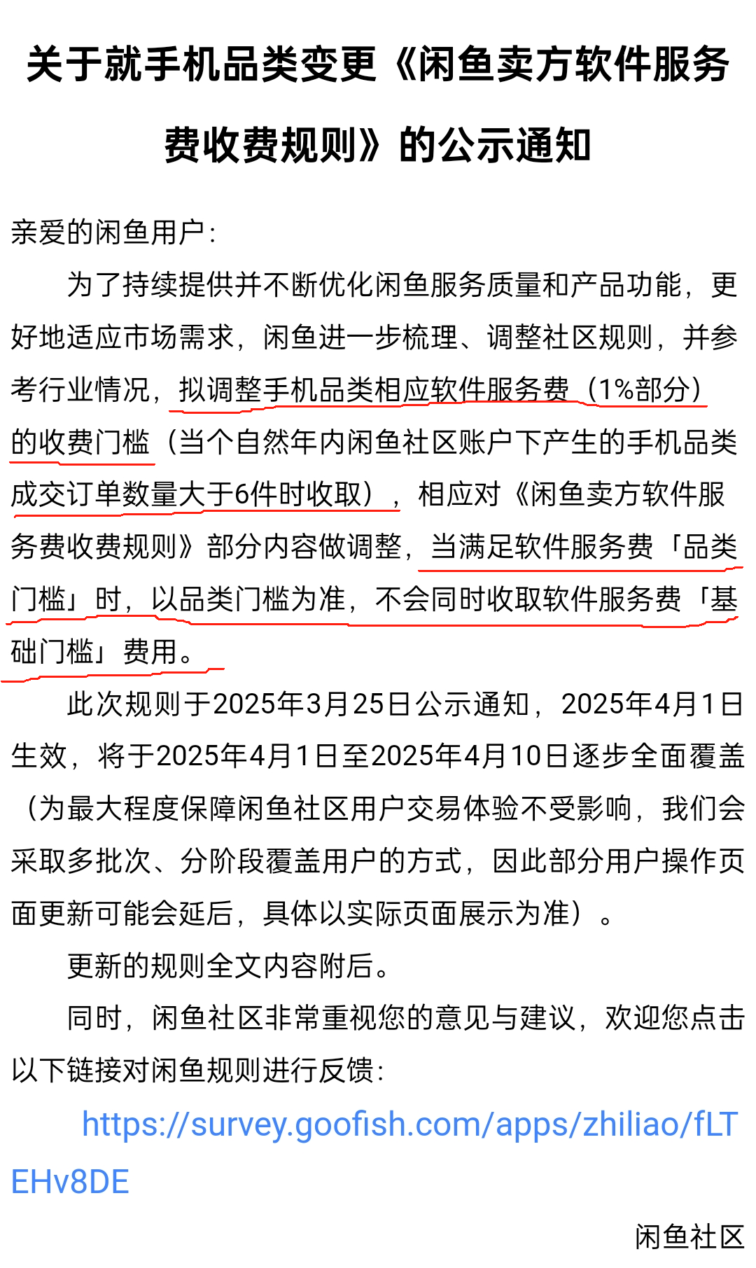 为了持续提供并不断优化闲鱼服务质量和产品功能,更好地适应市场需求,闲鱼进一步梳理、调整社区规则,并参考行业情况,拟调整手机品类相应软件服务费(1% 部分)的收费门槛(当个自然年内闲鱼社区账户下产生的手机品类成交订单数量大于 6 件时收取),相应对《闲鱼卖方软件服务费收费规则》部分内容做调整,当满足软件服务费品类门槛时,以品类门槛为准,不会同时收取软件服务费基础门槛费用。