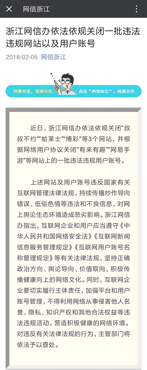 浙江网信办最近关了一拨违规网站及账号,理由是“内容低俗”。被毙掉的网站包括“叔叔不约”“蛤莱士”“博彩”等3个网站,被关闭的账号主要是“有来有趣”“网易手游”的一批违法违规用户账号。
