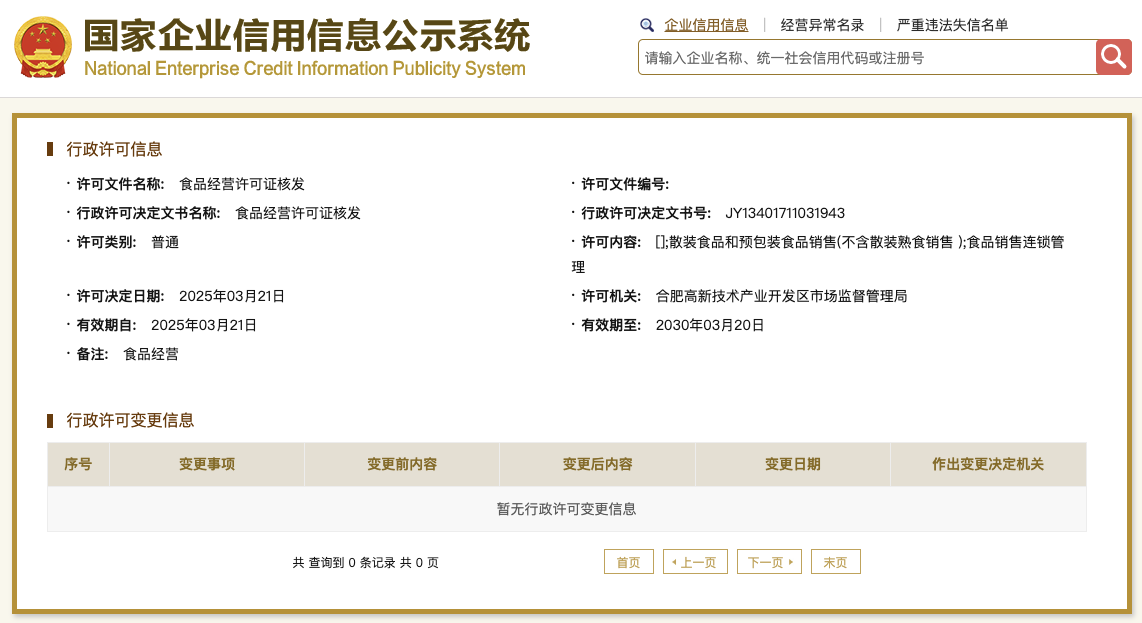 据界面,国家企业信用信息公示系统网站显示,近日,合肥三只羊网络科技有限公司新增食品经营许可证,许可内容为散装食品和预包装食品销售(不含散装熟食销售)、食品销售连锁管理,许可机关为合肥高新技术产业开发区市场监督管理局,许可决定日期为2025年3月21日。