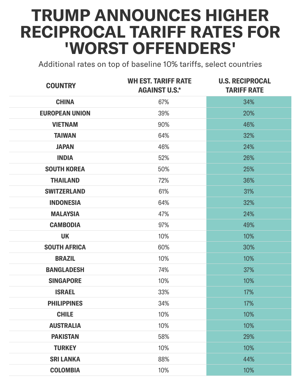 声明称,特朗普将对所有国家征收10%的“基准关税”,该关税将于美国东部时间4月5日凌晨0时01分生效。此外,特朗普将对美国贸易逆差最大的国家征收个性化的更高“对等关税”,该关税将于美国东部时间4月9日凌晨0时01分生效,所有其他国家将继续遵守原有的10%关税基准。声明还称,特朗普拥有“修改权限”,可以视情况提高或者降低关税。