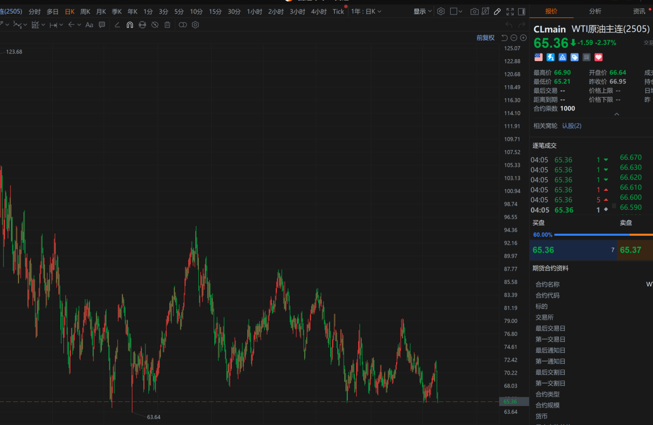 据财联社,WTI原油期货跌至2023年5月以来最低水平,最低报65.2美元/桶,日内跌2.5%。