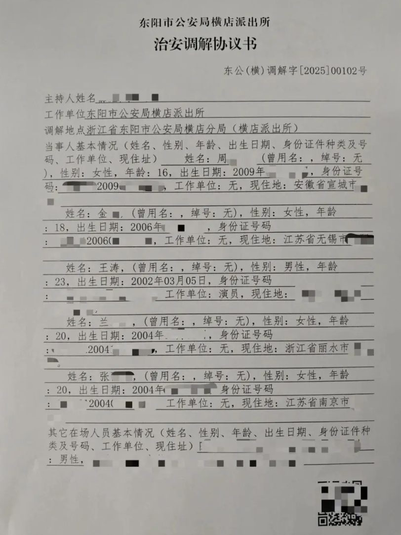 近日,针对近期4名不明身份人员跟至艺人住所并偷拍视频的严重侵权行为,我司已在第一时间报警处理。警方受理后认定4人行为致使艺人人格、名誉受损,应予以追究法律责任。鉴于不明身份人员中存在未成年人,且已深刻认识到自己的错误并主动书写了道歉信,我司和艺人综合考虑后决定予以谅解,在公安机关的调解下已达成调解协议。在尊重事实的前提下,我们决定公开该调解书及道歉信,希望以此为警示,共同维护良好的公共秩序和网络环境。