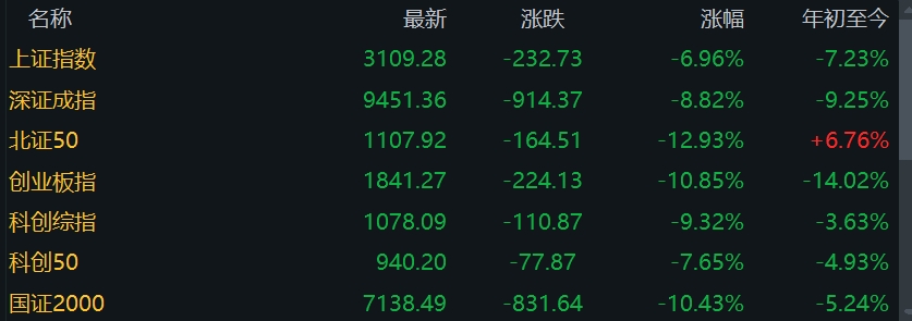 上证指数失守3100点位,跌7.24%,深证成指跌9%,创业板指跌11.07%。全市场超1000只个股跌停。