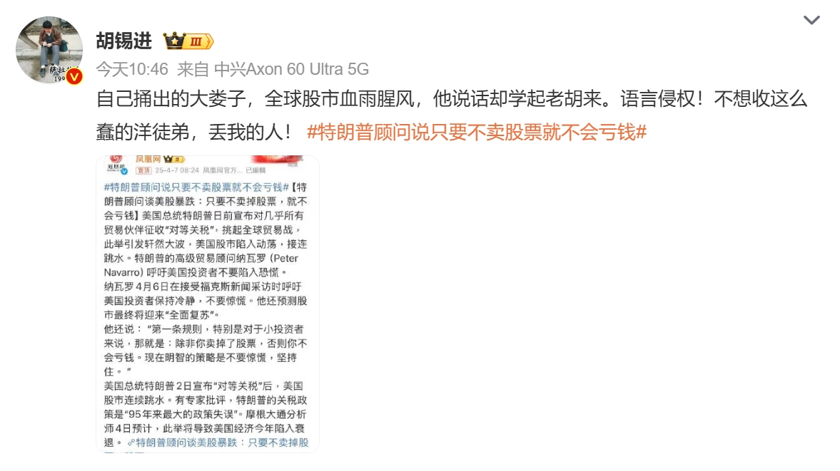 胡锡进回应:自己捅出的大娄子,全球股市血雨腥风,他说话却学起老胡来。语言侵权!不想收这么蠢的洋徒弟,丢我的人!